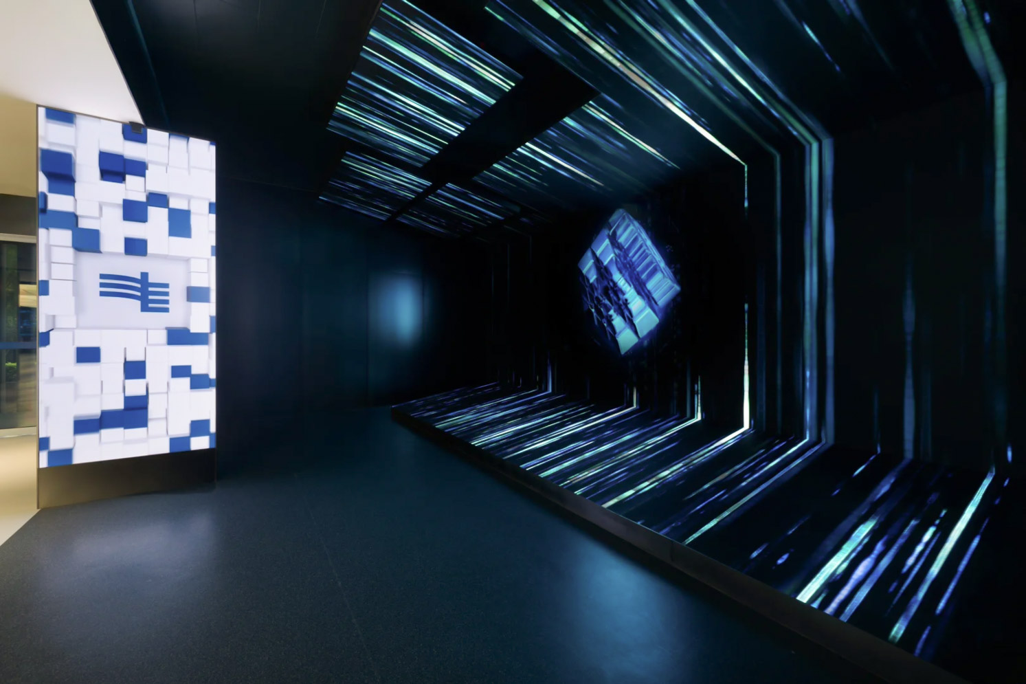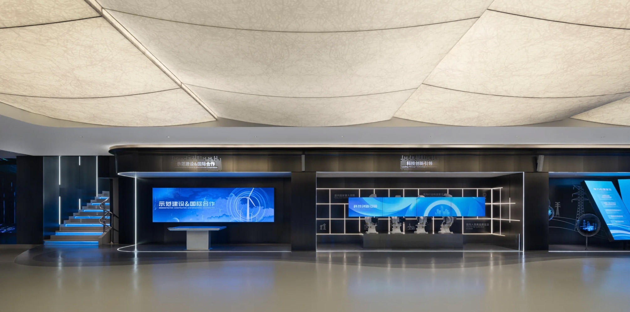 未来科技展厅不仅是技术展示的平台,更承载着品牌愿景、专业形象与对外传播使命。我们在材质选择上,摆脱了传统“冰冷科技感”的刻板印象,采用哑光不锈钢、磨砂玻璃等低反差材料组合。通过结构、光影、材质与动线的协同设计,打造兼具引导性与温度感的展厅空间。
